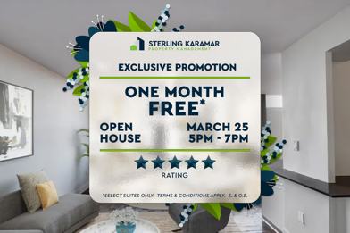 Rent Special available! Limited Time Offer | Enjoy One Month Free on a 13-Month Lease!* (Select Suites Only) Limited Time Offer | 1 Month Free on a 13-Month Lease!* (Select Suites Only) *Terms & Conditions Apply.