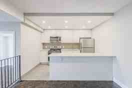 - Kitchen features brand new modern white cabinetry with chrome finishes, double sink, high-end counters and kitchen island - creating extra cupboard and counter space