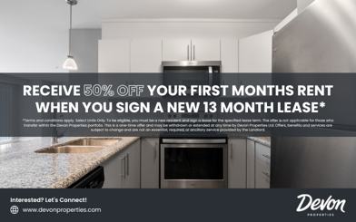 *Terms and conditions apply. To be eligible, you must be a new resident and sign a lease for the specified lease term. The offer is not applicable for those who transfer within the Devon Properties portfolio. This is a one-time offer and may be withdrawn or extended at any time by Devon Properties Ltd. Offers, benefits and services are subject to change and are not an essential, required, or ancillary service provided by the Landlord.