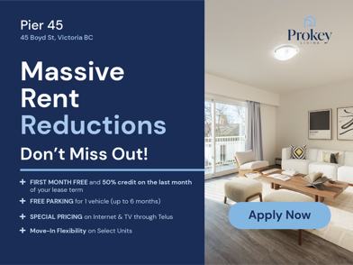 Welcome to Pier 45, where modern living meets the charm of Victoria’s iconic waterfront. Nestled in the heart of James Bay, this reimagined four-storey rental community offers 71 stylishly renovated suites with bachelor, one-, and two-bedroom layouts. Each suite features sleek cabinetry, premium appliances, and stunning bathrooms designed for comfort and contemporary living. Select homes also include in-suite washer and dryer units for added convenience.