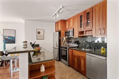 This generously sized home features a chefâ's kitchen outfitted with premium Bosch appliances, custom wood cabinetry, granite countertops, and a raised breakfast barâ??perfect for casual dining. The primary bedroom boasts sweeping views, beautiful hardwood floors, and custom-designed closets. Throughout the residence, you'll find a sophisticated mix of marble and hardwood flooring, creating a timeless, elegant atmosphere.A formal entryway with California Closets adds a refined touch and practical storage. Enjoy the comfort of freshly painted interiors, updated light fixtures and switches, and double-pane windows that ensure peace and quiet. Building amenities include an on-site concierge, a serene garden courtyard, a panoramic rooftop deck, rooftop laundry facilities, a library, and a business center. One-car parking and private storage are included. This pet-friendly community is move-in ready and impeccably maintained. Combining elegance, comfort, and convenience in one of the city's most desirable locations, this home offers essential appliances and thoughtful touches for effortless living. Donâ't miss outâ??first month free!