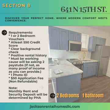 Welcome to 641 N 15th St., a beautifully updated 2-bedroom, 1-bathroom apartment that perfectly combines comfort, convenience, and modern living. This inviting home is Section 8 friendly and ready for the right tenant to enjoy all it has to offer. Step inside and you'll immediately notice the gleaming hardwood floors that flow throughout the spacious layout, creating a warm and welcoming atmosphere. The nice-sized rooms provide flexibility for your lifestyle, whether you need extra space for a home office, guest room, or simply want to enjoy comfortable living. Natural light pours through the windows, giving the entire apartment a bright and airy feel. The kitchen is designed with functionality and style in mind, featuring stainless steel appliances, a dishwasher, and plenty of cabinet space for all your cooking needs. Having a washer and dryer right in the unit adds incredible convenience, making laundry day stress-free. The bathroom is tastefully finished with classic tile and a full tub, perfect for relaxing after a long day. Every detail of this apartment has been thoughtfully put together to ensure both comfort and practicality. Located just a few blocks from Benjamin Franklin High School and Laura Wheeler Waring Public School, the property is in a convenient neighborhood setting with schools, shops, and local amenities nearby. If you're seeking a stylish apartment in a great location with the benefit of Section 8 acceptance, 641 N 15th St. is an excellent choice to call home. Section 8 (Accepting 1 br voucher) Requirements * 1 or 2 Bedroom Voucher * Atleast 550 Credit Score * No Evictions * Clean Criminal Record * Must be working cause will be asking 2 paystubs (If not, as many proof of income as you can provide.) * 1 Photo ID * $50 Application Fee (Non Refundable) Note: Monthly Rent and Security Deposit will be determined by PHA