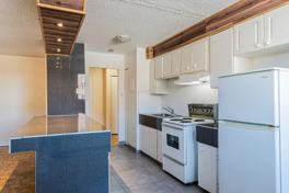 Beautiful kitchen with bar top dine in counter. The kitchen is equipped with a fridge, an oven, and a cooktop stove.