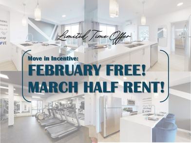 MOVE IN INCENTIVE : FEBRUARY FREE AND PAY MARCH HALF RENT!