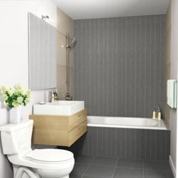 White kitchen cabinets, Subway tiled bathroom.