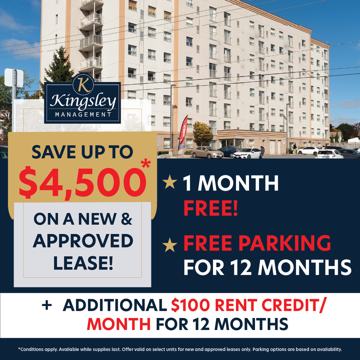 Rent Special available! Limited Time Offer: 1 Month Free, Free Parking for 12 Months, and an additional $100/month rent credit for 12 months for new & approved leases! *Conditions apply. Available while supplies last. Offer valid on select units for new and approved leases only. Parking options are based on availability.