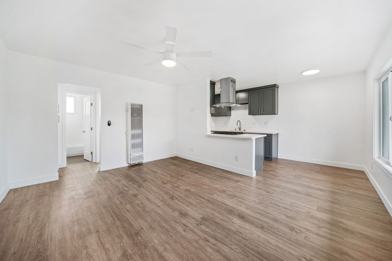 Beautiful, spacious apartment home has been completely remodeled featuring a designer kitchen with quartz counters and custom cabinetry, custom tile work, beautiful flooring, ceiling fans and more.