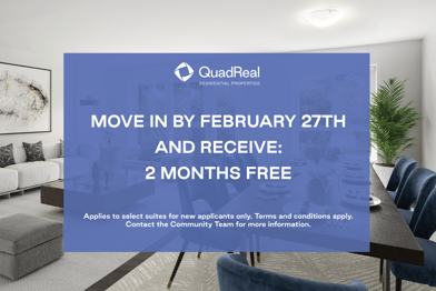 Rent Special available! 2 Months Free Rent Applies to select suites for new applicants only. Terms and conditions apply. Contact the Community Team for more information.