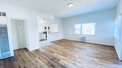 Spacious layout featuring fresh paint, hardwood floors, a new wall A/C unit, gas wall heater, new ceiling fan with lights on a dual dimmer switch, and large new windows with updated blinds.