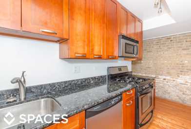 Rehabbed one-bedroom unit in Logan Square has a modern kitchen with a dishwasher, hardwood flooring, spacious rooms with central airconditioning, an updated bathroom, and central heating and air conditioning, laundry on-site. Cats are welcome.