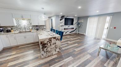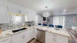 Our Speakeasy unit is the height of decadence, luxury and custom design. Our kitchen includes an upgraded appliance package with a large fridge with ice maker and water dispenser, the aforementioned waterfall island granite that extends to the floor. The backsplash has a 1920s specialized gold inlay pattern tile with custom crafted wood hewn shelving that are the utmost in 1920s opulence. New dishwasher, stove, microwave, modern open hood range for cooking. We have a newly installed in unit laundry that is a large washer-dryer in one. Just put your clothes in and it will wash and then dry using the most modern technology available. Our two bedrooms include a king burlesque-style room authentic to our period theme with a velvet and toulee dressed king canopy bed, fainting couch and gold dresser. Our queen bedroom has a mafia boss vibe with a custom bamboo wood headboard with built in lighting and a more rustic design for our more masculine guests. The Speakeasy is one of our favorite themes in our portfolio with a warm, welcoming comfortable feel no matter where in the unit you are. There are a myriad of delightful touches throughout from the period black and white photos to the apothecary-style mirror in the bathroom to the end table that appears to be an underground tunnel to escape the unit during a prohibition police raid.