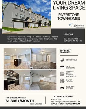 Gorgeous 3 and 2 bedroom, 2 bathroom townhomes available for rent in Jenison close to highway access and more. Equipped with stainless steel kitchen appliances (stove, refrigerator, dishwasher, and microwave), and full sized laundry! This property features attached garages, extra off-street parking, covered entry, and a back patio with privacy fence. Each room has large windows letting in natural light, brand new flooring, and fresh paint. Large closets provide extra storage in each bedroom, second floor hallway, and kitchen. Bright recess lighting in the lower level and open layout gives this unit a modern feel.