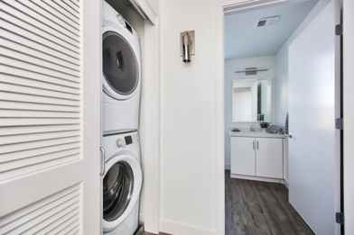 This large open-concept single-level 1 bedroom 1 bathroom apartment. The home is well lit and has beautiful modern dark gray wood-patterned luxury vinyl tile (LVT) floors; high ceilings; quadruple-pane windows; forced air conditioning and heating; a fenced-in patio; and a full-size washer and gas dryer in the unit. The modern open kitchen has a Caesarstone quartz countertop and backsplash and stainless steel GE appliances including a gas range. The large bathroom has high-end finishes and a tub. The apartment is uber-efficient with a Navien tankless gas hot water heater, LED lighting, and spray foam insulation for superior sound insulation and temperature regulation. Each unit is assigned 1 free parking spot along with access to bike parking. Landscaping is free for all communal areas, this apartment is just minutes away from Berkeley, Larkspur, and downtown San Francisco.