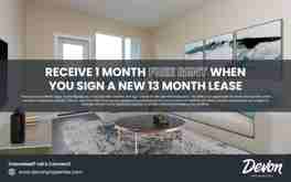*Terms and conditions apply. To be eligible, you must be a new resident and sign a lease for the specified lease term. The offer is not applicable for those who transfer within the Devon Properties portfolio. This is a one-time offer and may be withdrawn or extended at any time by Devon Properties Ltd. Offers, benefits and services are subject to change and are not an essential, required, or ancillary service provided by the Landlord.
