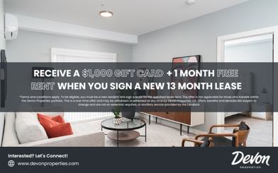 Receive a $1000 GIFT CARD + 1 Month FREE RENT When You Sign a New 13 Month Lease Orchard Walk Apartments is a four-storey, 140-unit two-building apartment complex located in West Kelowna. The new development offers a mix of one-, two-, and three-bedroom suites, with spacious layouts, contemporary kitchen aesthetic, and new appliances. Residents enjoy many perks such as a fitness center and a pet washing facility for their exclusive use and convenience. Orchard Walk location provides a rural feel with urban advantages, with proximity to shopping amenities, local restaurants, and public transit. *Terms and conditions apply. Contact the leasing team for details. To be eligible, you must be a new resident and sign a lease for the specified lease term. The offer is not applicable for those who transfer within the Devon Properties portfolio. This is a one-time offer and may be withdrawn or extended at any time by Devon Properties Ltd. Offers, benefits and services are subject to change and are not an essential, required, or ancillary service provided by the Landlord.