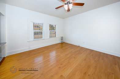 These centrally located apartments feature large windows, wood-style flooring, ceiling fans, and spacious closets with mirrored sliding doors. Kitchens include a gas stove, refrigerator, and ample cabinet space. Bathrooms offer tiled shower walls and modern fixtures.