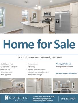 BEAUTIFUL BRAND NEW!!! 3bed 2 bath waiting for you to call home. Walk in to a open concept living room and kitchen and a big island for your family dinners. Spacious master bedroom and bathroom. Home located in our Beautiful Community Starcrest Terrace. Call the home won't last long 701-258-9404.