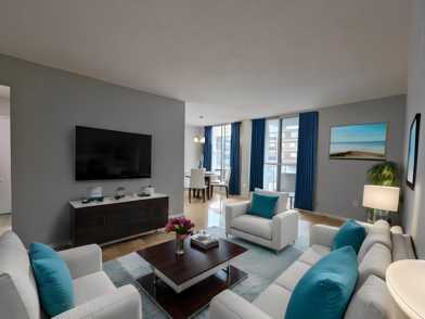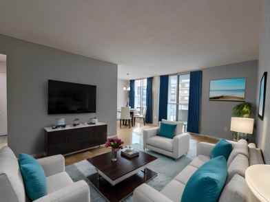 The one-bedroom unit is spacious and bright, with hardwood floors, ceramic tiles, a balcony, and a fridge and stove included. The building also offers elevators, laundry facilities, storage lockers, video surveillance, visitor parking, and on-site staff and management. The rent is $2300 per month, which includes water, electricity, and heat. Pets are not allowed in this building.