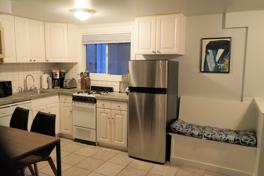 Large bedroom with 2 closets and plenty of room for a desk and bureau. Wood flooring. Full bathroom, living room and step up eat-in kitchen with dishwasher, gas oven, concrete countertop, and stainless steel refrigerator. Shared laundry (with just 1 other apartment) and shared spacious backyard deck for sunset views.