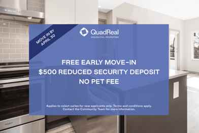 Rent Special available! Free Early Move-In Applies to select suites for new applicants only. Terms and conditions apply. Contact the Community Team for more information.