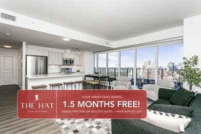 Inside the Hat, you'll find open-concept European-inspired suites with designer finishes and balcony views of Edmonton's flowing North Saskatchewan river. Tenants have access to full-time onsite maintenance and property leasing agents, main floor retail shops, an outdoor patio, state-of-the-art exercise facilities with wifi, and more.