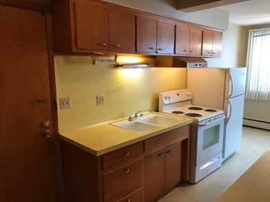 These large 1 bedrooms have a galley style kitchen with tons of cabinet and and countertop space. There is a dining room area off kitchen fit for a small table, a large living room, wall A/C and a bedroom and bathroom to complete unit.