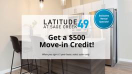 Latitude 49 at Sage Creek is a pet-friendly community that offers one, two and three bedroom apartments for rent in the vibrant Sage Creek neighbourhood of southeast WinnipegSuites are fully equipped with central heat, air conditioning, full-size stainless-steel appliances (including dishwasher and microwave), in-suite laundry and modern finishes such as quartz countertops and luxury vinyl plank flooring. Rent includes water, in-suite laundry and exclusive access to a resident clubhouse.* Same-day application approvals are available.* Rates are based on a one-year lease and may vary by floor/layout.* Reduced security deposit for seniors.* Pet restrictions apply.