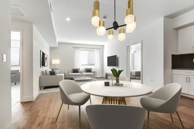 Our luxury apartments feature beautiful kitchens completed with quartz countertops and premium energy efficient appliances. At 10 feet in height, the ceiling adds an open feeling to the rooms, the living areas and bedrooms are bright and spacious with a thoughtful architectural layout to maximize all living space and create enough storage space. All the units are equipped with washer and dryer machines. wood style flooring throughout.