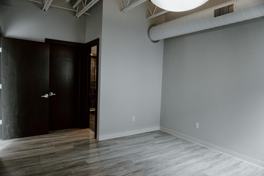 Apartment 2A features a large 2-bedroom, 2-bathroom + Study floor plan, high-quality vinyl plank flooring, dimmable LED lighting, industrial chic design, a chef's kitchen complete with a bar area and wine fridge, a handcrafted vanity and reclaimed island, gas fireplace, southern exposure and views of the micropark, dedicated central air and heat, on-demand hot water, and is ready for a projector with ceiling power and HDMI connections.