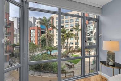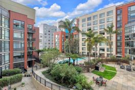 This unit is a charming contemporary 1BR + den condo. It features a spacious, light-filled open floor plan that seamlessly integrates the bright and elegant living/dining space and modern kitchen, creating the perfect venue for entertaining. The living room boasts large floor-to-ceiling windows overlooking the lush, manicured courtyard & resort-style pool. The modern kitchen features a center island, stainless steel appliances, granite countertops, & custom cabinetry. The serene bedroom overlooks the lush courtyard and offers a walk-in closet with organizers and an adjoining bathroom. The versatile den space is ideal for a home office. Additional features include in-unit laundry & storage closets, freshly painted walls, modern lighting fixtures, & one-car independent garage parking.