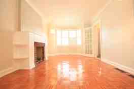 - Living room showcases a beautiful brick fireplace, French door