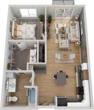 The bright, open-concept floor plans are fit with nine-foot ceilings, quartz countertops, subway tile backsplash, stainless steel appliances and and an island with pendant lighting. The large windows placed throughout each unit provide an abundance of natural light, bringing the outdoors in. You will especially love the in-home washer and dryer, private balcony and ample linen and closet storage.