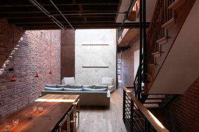 There is a courtyard with outdoor dining and seating.