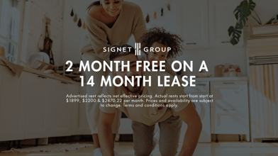 Rent Special available! *Limited Time Offer: Get 2 Months Free with a 14 Month Lease! Applicable on select suites. Net effective rent being advertised. The actual rents are between $1,794 to $2,975 /month. Promotional offer is based on a 14-month lease with 2 months free. Subject to change without notice. Terms and conditions apply. Schedule a tour to learn more