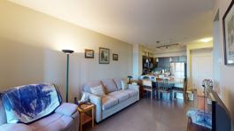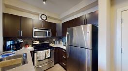 The condo is beautiful with warm, neutral colours, cork, tile, and carpet flooring.