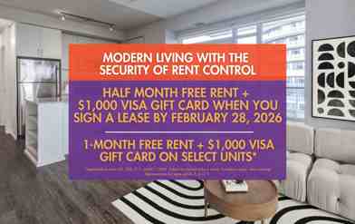 Rent Special available! Half Month FREE Rent + $1,000 Visa Gift Card when you sign a lease by February 28, 2026 1-Month FREE Rent + $1,000 Visa Gift Card On Select Units* *Applicable to units 102, 202, 712, and 811 ONLY. Subject to change without notice. Conditions apply. See a Representative for more details. E. & O. E.