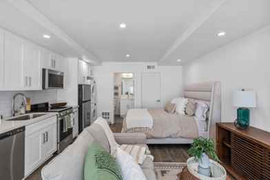 NEW STUDIO, 1 Bathroom apartment comes with: Free Standing AC unit, Shaker white cabinets in the kitchen and bathrooms, white quartz counters, tile floors in the bathroom, stylish wood laminate floors in the living room, kitchen & bedrooms, new SOAKING (DEEP) tub and wall tile, Recessed lighting, STAINLESS STEEL APPLIANCES (dishwasher, range, microwave & refrigerator), WASHER and DRYER in unit, fixtures and SMOOTH CEILINGS throughout! building with onsite manager. Right across the street from Freedom Park with walking trails.