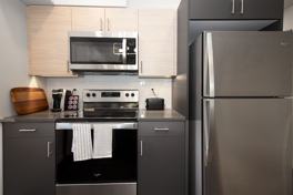 The kitchens are finished with stylish modern details, including granite countertops, under-cabinet lighting, a farm-style sink, high-arc faucet with sprayer, plenty of kitchen storage, and a full stainless steel appliance package that includes a stove, refrigerator, dishwasher, and over-the-range microwave. These thoughtful finishes help create a space that feels both polished and practical.