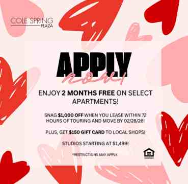 Rent Special available! Now Leasing: Enjoy TWO MONTHS FREE towards select apartments + apply within 72 hours of touring and snag $1,000 off your rent! PLUS Get a $150 gift card to local shops! *Restrictions may apply. Must move by 02/28/2026. REDUCED RATES ON STUDIO APARTMENTS AT $1,499! Longer lease terms now available! Schedule your personalized tour today or call for details!