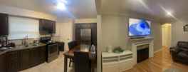 -Huge, upgraded and elegant kitchen with modern countertops and sink. Includes stainless steel appliances and plenty of storage area provided by many cabinets.