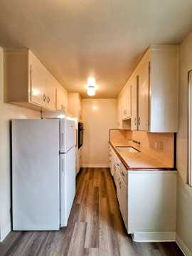 Spacious 2 bedroom, 1 bath apartment in great Santa Clara location. Unit is located on the first floor, and is an end unit. Wall to wall carpet throughout, with exception to the luxury vinyl plank flooring in the entryway, kitchen, and bathroom. Double pane windows and vertical blinds throughout. The kitchen includes tiled counter-tops, a refrigerator, electric cook-top stove, and electric wall-mount oven. Double sided gas wall heater in the living room and hallway. Shower-tub combo and Formica counter-top in the bathroom. Overhead lighting in both bedrooms. This 7-plex building offers coin-op laundry, one uncovered parking space, a storage cabinet, and some street parking, as well. Building is directly across from Harman Elementary School and Steve Carli Park.