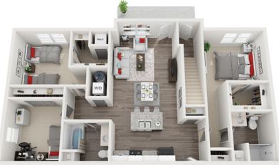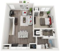 This floor plan is everything you've dreamed of. Each unit comes with a private entrance to the unit, private garage, and private patio or balcony. The appliances included are a refrigerator, microwave, garbage disposal, stove, dishwasher, and in-unit washer and dryer. Granite countertops and plank flooring are also resident favorites!