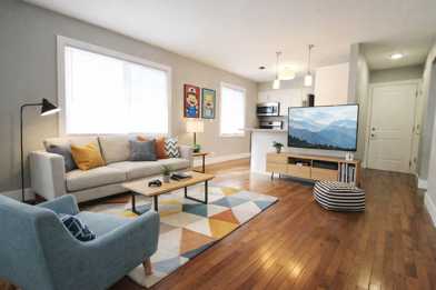 Energy-efficient LED lighting helps reduce your carbon footprint while keeping your electricity bills low. The gas furnace and stove offer efficient heating and cooking options. The solid surface counters add a touch of elegance to the kitchen space. Hardwood floors throughout the apartment create a warm and inviting atmosphere.