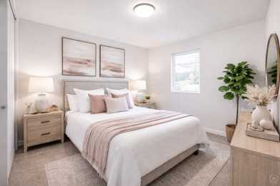 Each apartment features wood-style flooring, a soft neutral color palette, and open living spaces filled with natural light. Kitchens are thoughtfully designed with white cabinetry, quartz-style countertops, stainless steel appliances, and breakfast bars for everyday convenience. Select homes include private outdoor spaces, and in-unit laundry hookups are available.