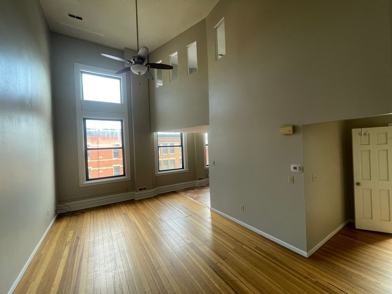 Loft style space with 1 bedroom and 1 bathroom with a walk in shower on the main floor, along with open space complex for the living room with high vaulted ceilings, with large windows over looking the downtown area along with the kitchen that features dishwasher, stove/oven, microwave, and double doors refrigerator and generous cabinet space.