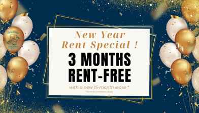 Rent Special available! THREE MONTHS RENT FREE Receive THREE MONTHS RENT FREE! This limited time offer is available for new applications on select suites with a 15 month lease term. Contact our leasing agent for further details!