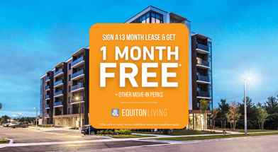 Rent Special available! 1 MONTH FREE RENT on a 13-month lease, OR a $200 monthly utility credit on a 13-month lease, OR a gift card from everythingcard.ca.* *Offer valid on select suites. Value must not exceed 1 month’s rent value. Additional terms and conditions may apply.