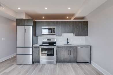 Design: Our team has created a bedroom with a walk-in closet that includes built-in shelving AND your washer and dryer. The kitchen has a sleek backsplash, Carrera countertops, and soft-close cabinets.