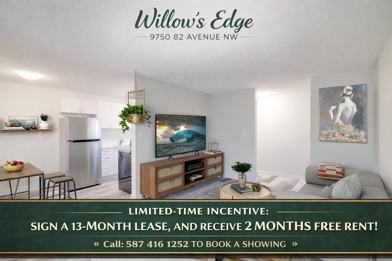 Welcome to Willow’s Edge! Limited-Time Incentive: Sign a 13-month lease and receive 2 MONTHS FREE RENT! (Free rent incentive applied to the 2nd and final months of the lease) Amenities & Features - Classic and renovated suite options to suit every budget - Stainless steel appliances, including dishwasher - Modern laminate flooring - Bright, spacious living areas with functional layouts - Pet-friendly community – cats and small dogs welcome - Heat and water included - Affordable parking available - Suites equipped with essential appliances, including stove and fridge - Shared laundry facilities conveniently located in the building - Clean, well-maintained common areas - Professional maintenance team with emergency line available - Tenant referral program – refer a friend and enjoy rewards - Exclusive 25% discount on TELUS services, including high-speed internet, TV, and home phone Neighborhood - Located just off Whyte Avenue, home to a wide variety of restaurants, cafés, pubs, and local eateries - Steps away from popular dining spots and coffee shops along Whyte Ave - Close to grocery stores, shopping centers, and everyday conveniences - Near parks, walking paths, and recreation facilities - Easy access to major bus routes and public transit - Convenient commute to the University of Alberta by transit, bike, or car - Short drive or transit ride to downtown Edmonton and the river valley - Lively, walkable neighborhood with a balanced residential feel About the Property Willow’s Edge offers comfortable, well-maintained living in a prime south-central Edmonton location. With modern upgrades, stainless steel appliances, and flexible suite options, the property is designed to meet a variety of lifestyles and budgets. Enjoy the convenience of living steps from Whyte Avenue while still having a quiet, welcoming place to call home! Take advantage of our limited-time 13-month lease incentive and make Willow’s Edge your next home! Professionally Managed by MyVic Property Management Book a showing today! Call 587-416-1252