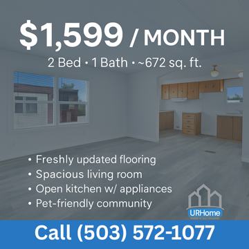 $1,599/month | 2 Bedrooms | 1 Bath | New Flooring | Lents Neighborhood Discover this freshly upgraded 2-bedroom manufactured home, featuring brand-new flooring throughout, nestled within a well-maintained RV park community in Portland’s vibrant Lents area. Enjoy the privacy of a standalone home combined with the convenience of community amenities. Perfect for those seeking affordability without sacrificing comfort! Your Space Includes: 600 sq. ft. bright layout with new flooring (luxury vinyl/laminate) Full kitchen, on-site laundry access, & storage Dedicated lot with off-street parking Pet-friendly policy (fees apply) Community Perks: -Prime Lents Location -8 miles to downtown Portland (easy I-205 access) -Steps to Foster Road dining, Lents Farmers Market & Zenger Farm -5-minute drive to Brentwood/Lents Parks RV Park Benefits -Quiet, friendly neighborhood vibe -Shared green spaces & walkability --Park maintenance